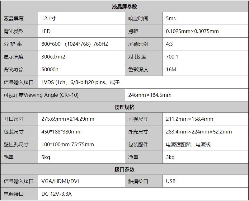 12.1寸工業(yè)觸摸顯示器基本參數(shù)