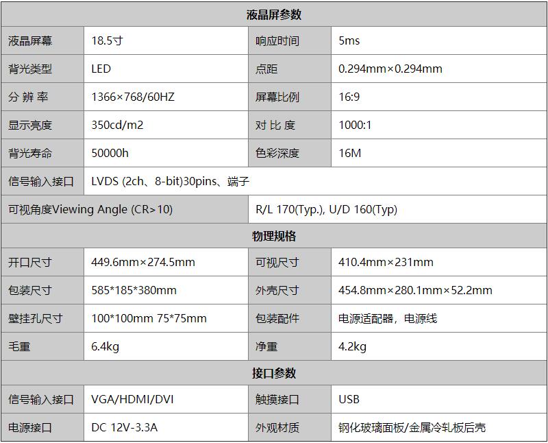 18.5寸工業(yè)觸摸顯示器基本參數(shù)